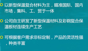 公司是一家瞄準(zhǔn)國際、國內(nèi)市場,集科、工、貿(mào)于一體的綜合性公司,擁有各類先進(jìn)的設(shè)備100余臺(套),公司自主研發(fā)了新型保溫材料及彩鋼復(fù)合保溫板材連續(xù)生產(chǎn)工藝,建成了機上一次成型彩鋼復(fù)合保溫板材的生產(chǎn)線...